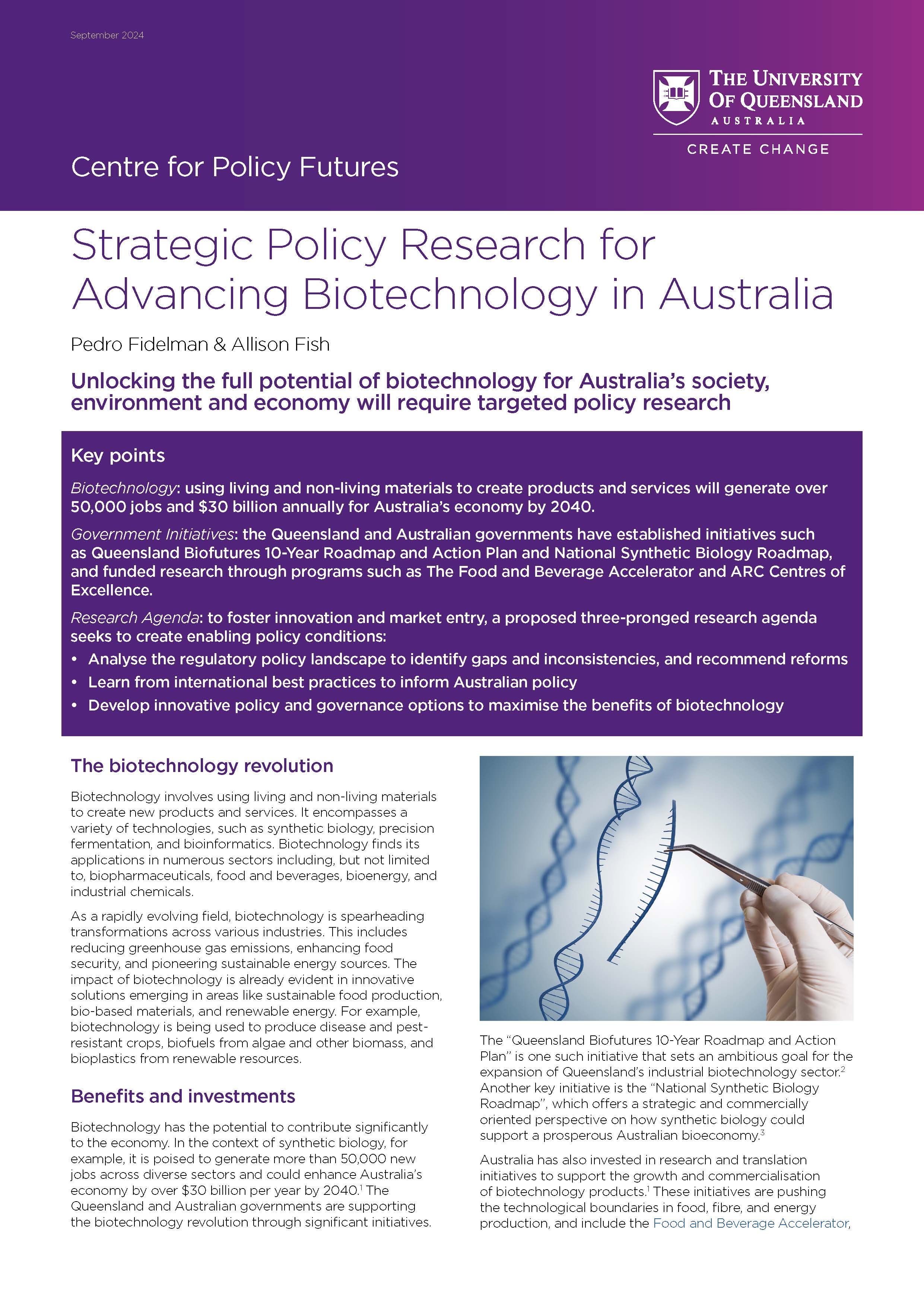 ![]() | Policy Brief | 2024 Strategic Policy Research for Advancing Biotechnology in Australia Associate Professor Pedro Fidelman & Dr Allison Fish |